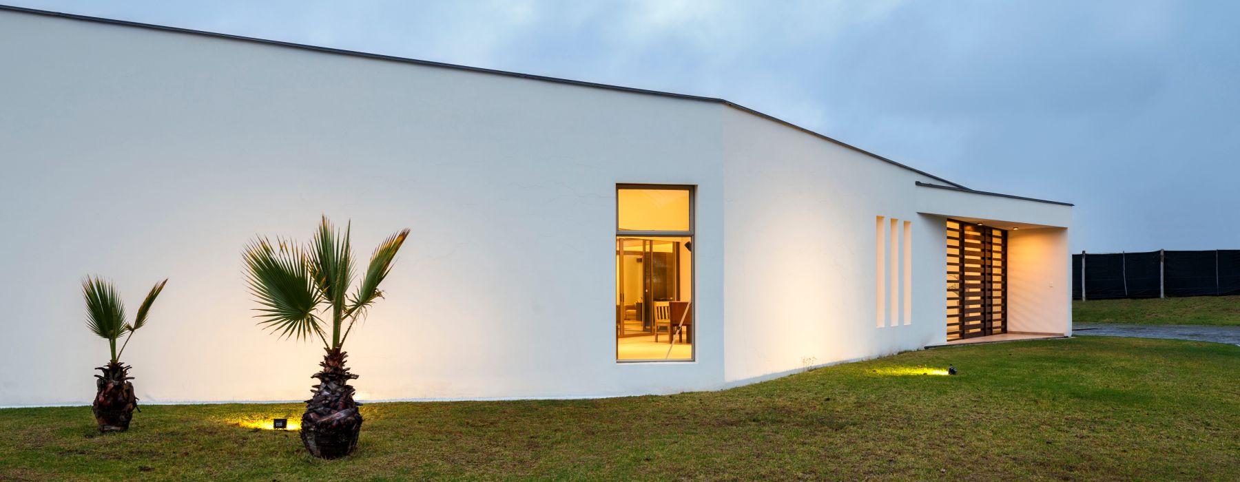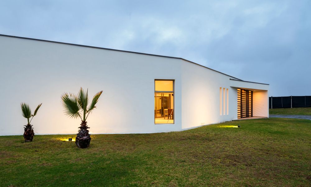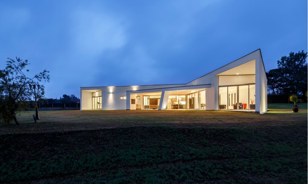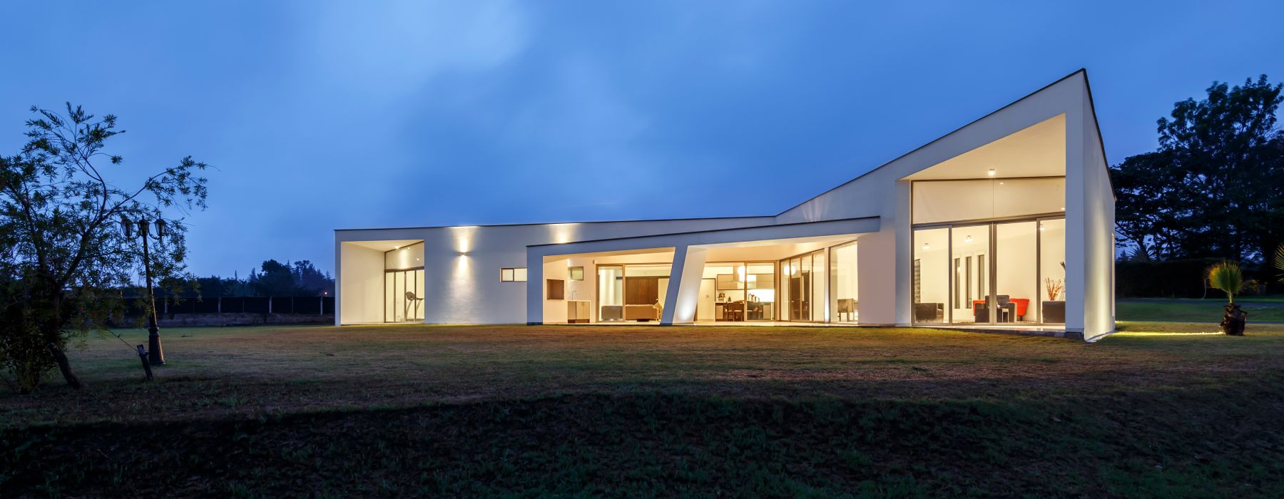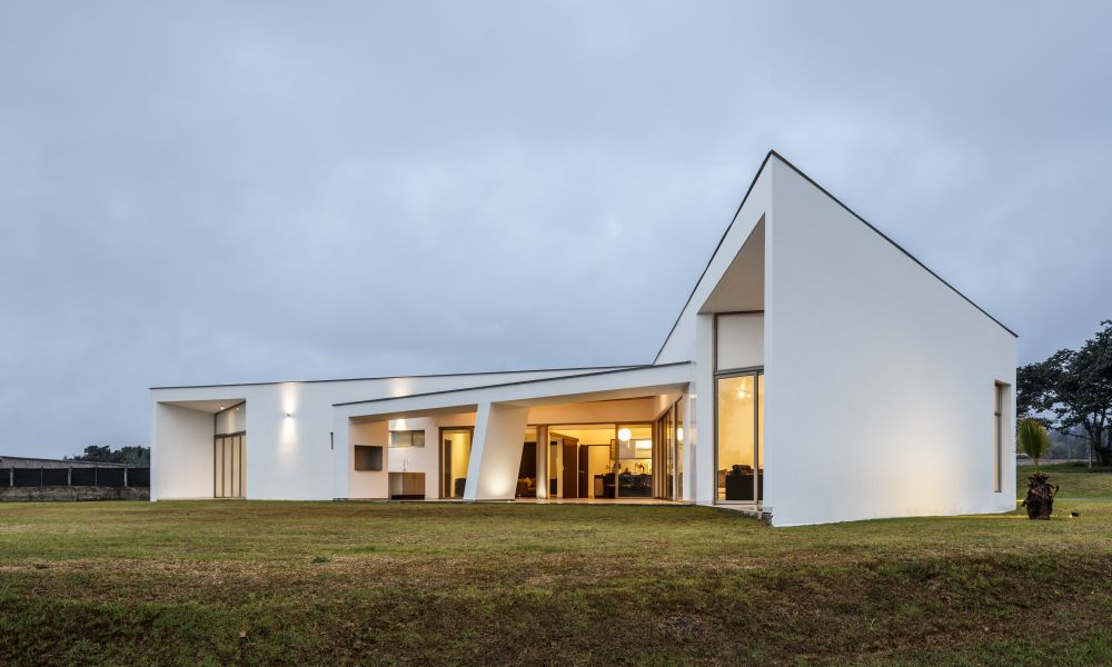 La casa está resuelta en una sola planta, configurando dos alas que responden a un orden programático, donde por un lado está el área social y por otro el área de las habitaciones. El objeto parte como un único elemento volumétrico que se expone a una serie de operaciones geométricas que lo redefinen, creando tensiones, vaciados y jerarquías a través de las cuales se reconfigura manteniendo su integridad volumétrica. La cubierta se conforma partiendo de una horizontalidad que se transforma emergiendo con una ligera