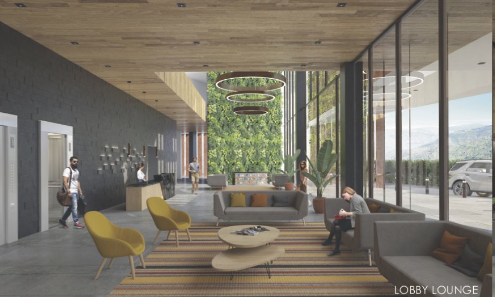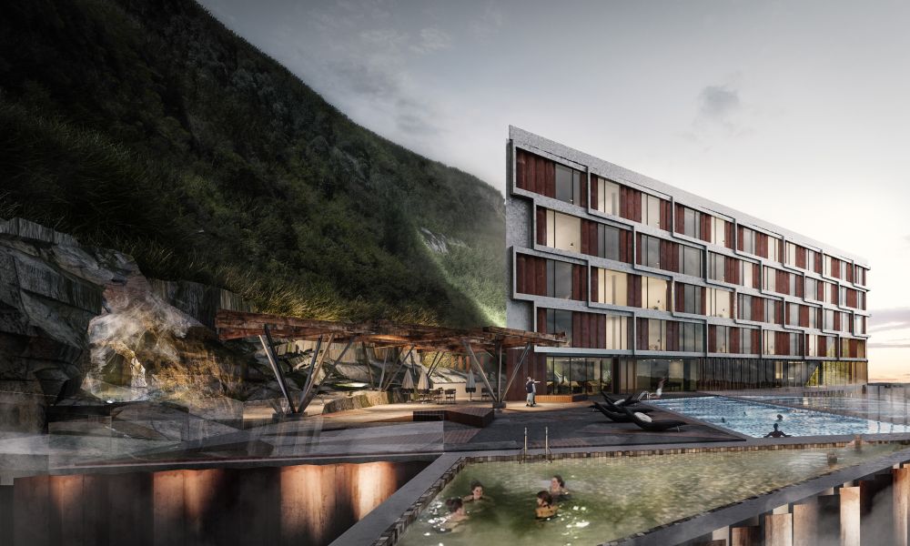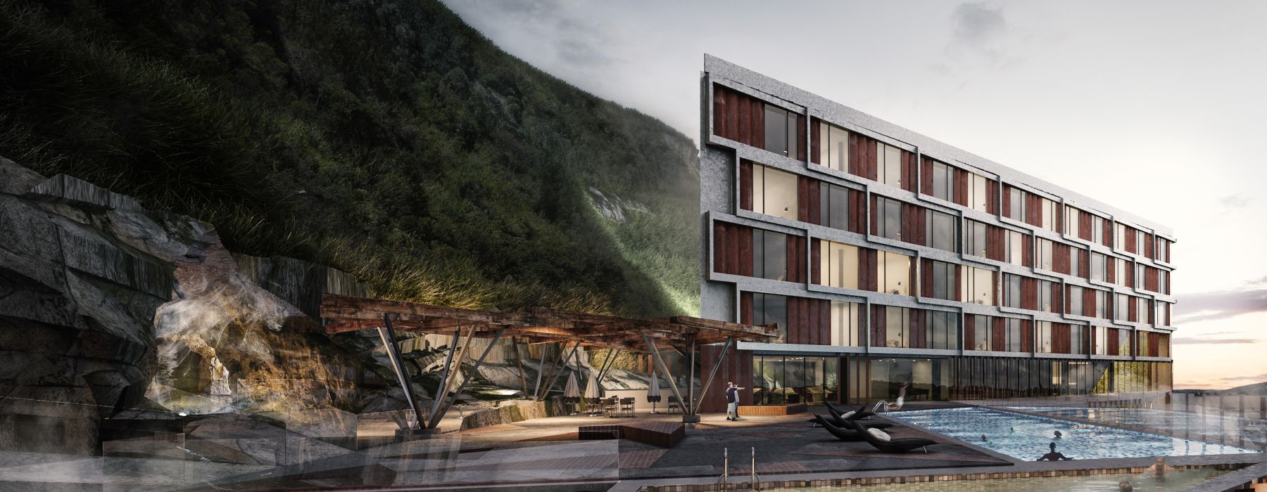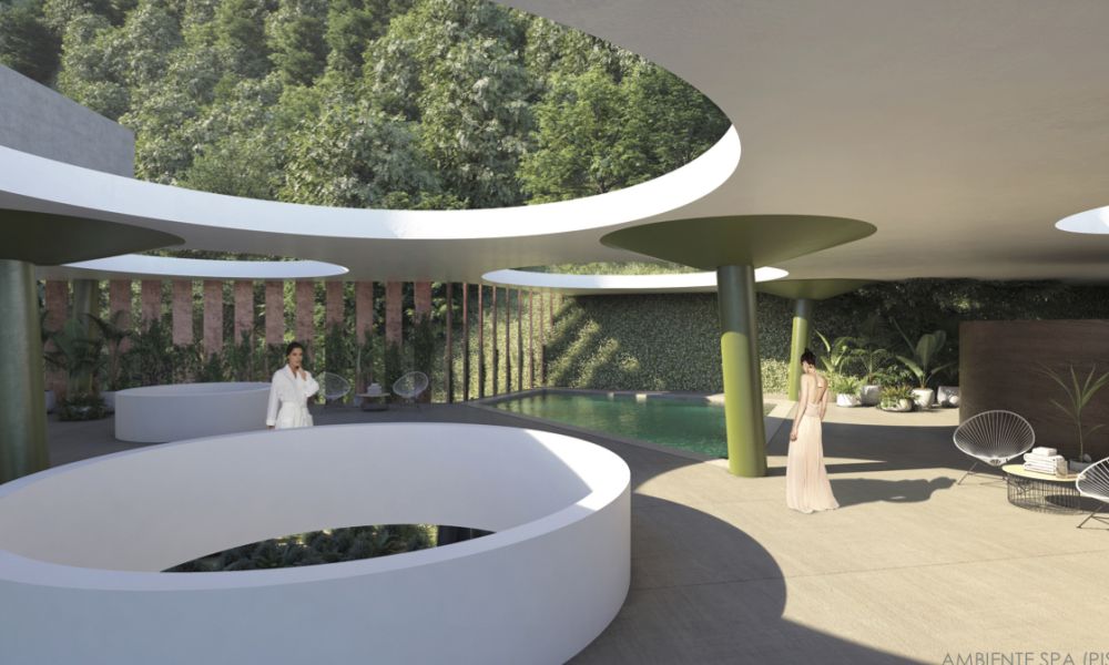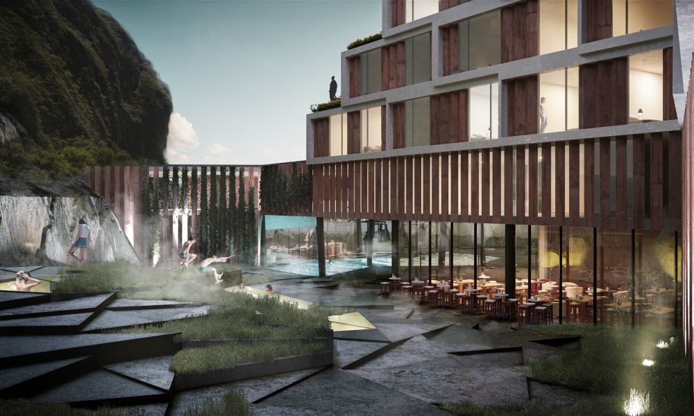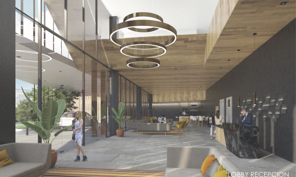 la reconfiguración geométrica de la barra define cinco zonas exteriores con distintas condiciones espaciales y visuales, estas son las que enriquecen y definen a la experiencia de aproximación y exploración del edificio. Una zona frontal que constituye el vinculo con la ciudad, una zona de acceso que recibe a los visitantes donde se ubica el lobby, dos recreacionales que se enlazan y relacionan entre sí y con la montaña y una última que comprende la zona de servicio.