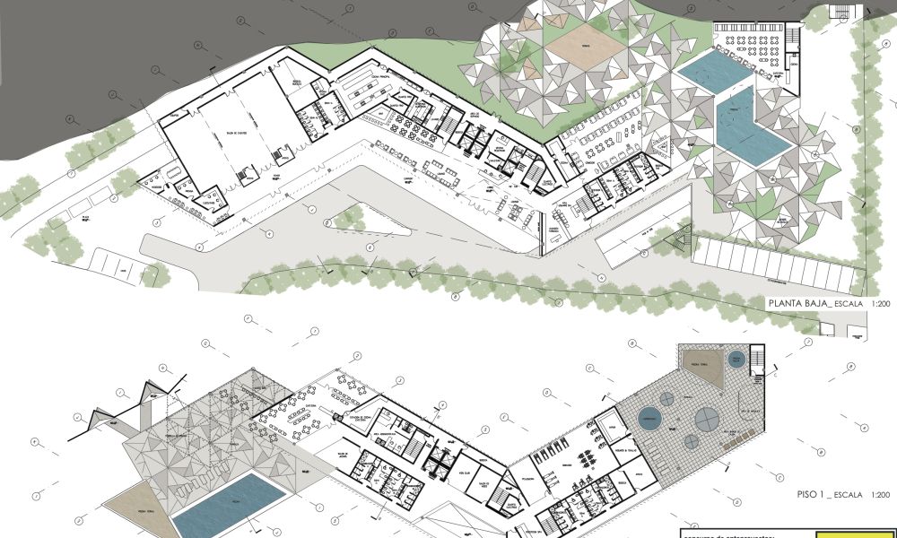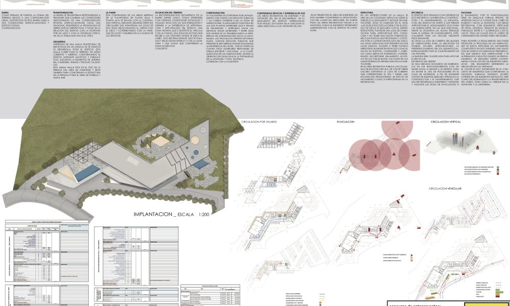 La forma del terreno induce a una configuración lineal. Disposición de esta barra marca dos condiciones: edificio-montaña y edificio ciudad. Una barra se transforma respondiendo a tensiones que cambian las condiciones mencionadas de una configuración frontal edificio-montaña hacia una diagonal; rompiendo la frontalidad se abren nuevas perspectivas y fugas en la relación del edificio con la montaña por un lado y con la vecindad cercana de la población hacia el otro.
