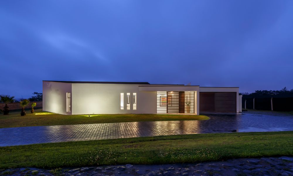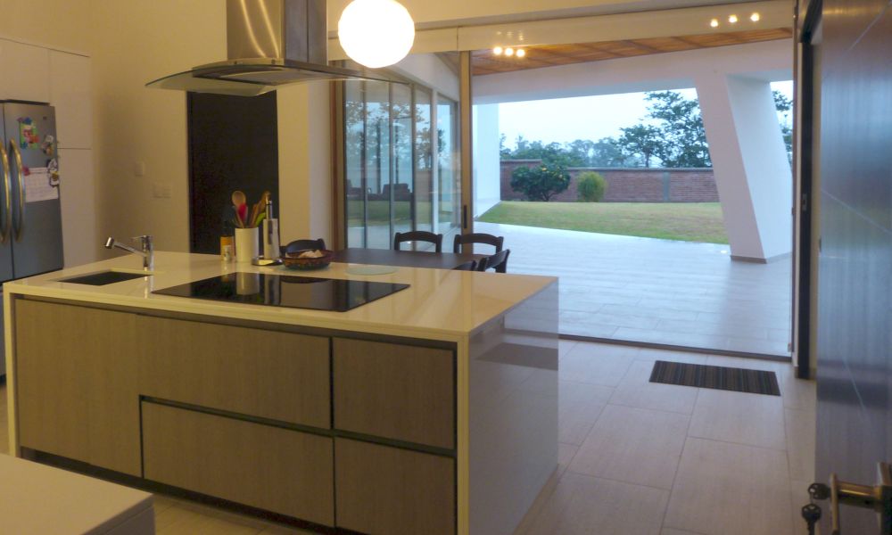 La relación hacia el exterior se da fundamentalmente en torno al porche al cual convergen el comedor, la cocina y el estar, así como por los vaciados en los extremos del volumen. La luz juega un papel fundamental, la extrusión y vaciado de tres lucernarios en el pasillo tienen un papel protagónico, su orientación varía entre este y oeste generando una condición cambiante en la iluminación.