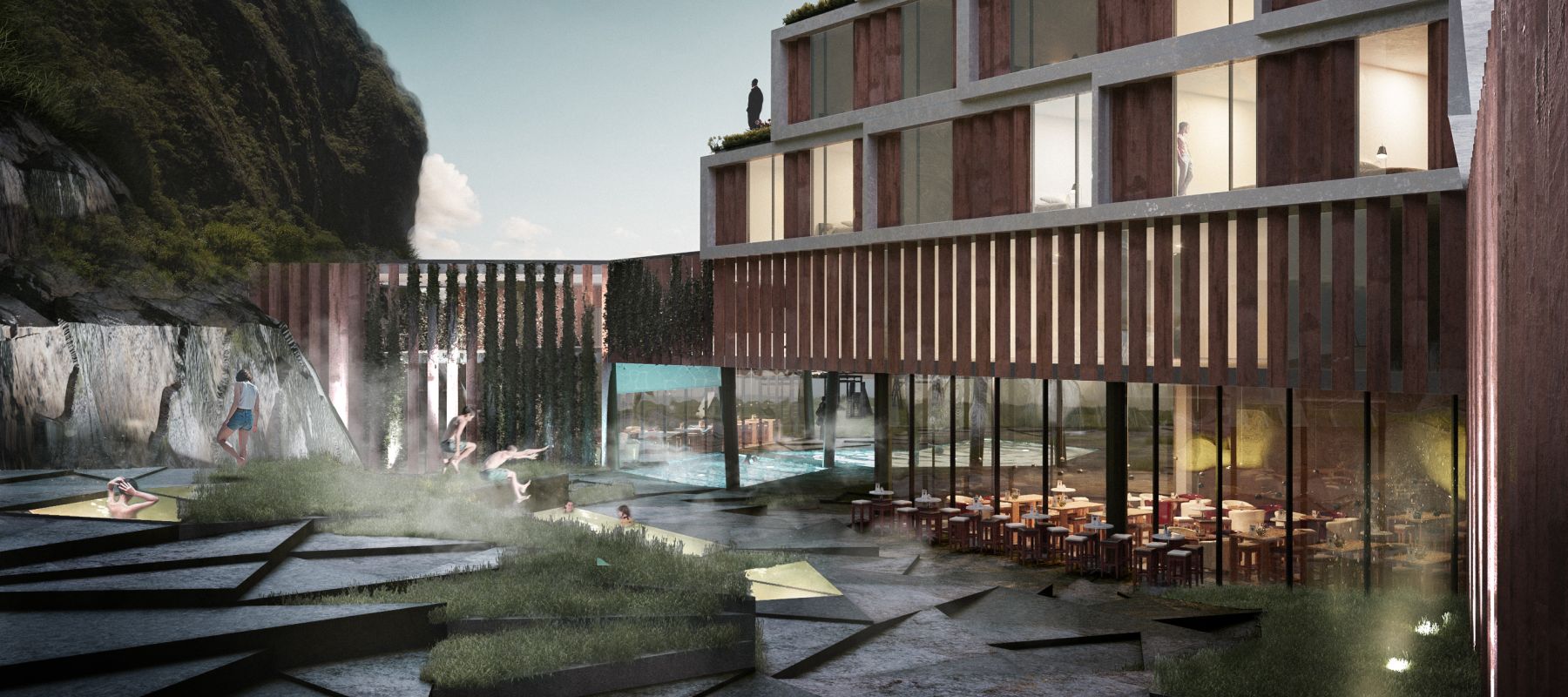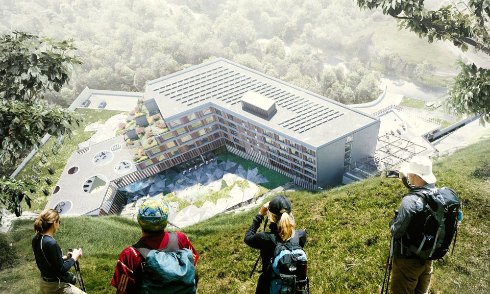 la reconfiguración geométrica de la barra define cinco zonas exteriores con distintas condiciones espaciales y visuales, estas son las que enriquecen y definen a la experiencia de aproximación y exploración del edificio. Una zona frontal que constituye el vinculo con la ciudad, una zona de acceso que recibe a los visitantes donde se ubica el lobby, dos recreacionales que se enlazan y relacionan entre sí y con la montaña y una última que comprende la zona de servicio.